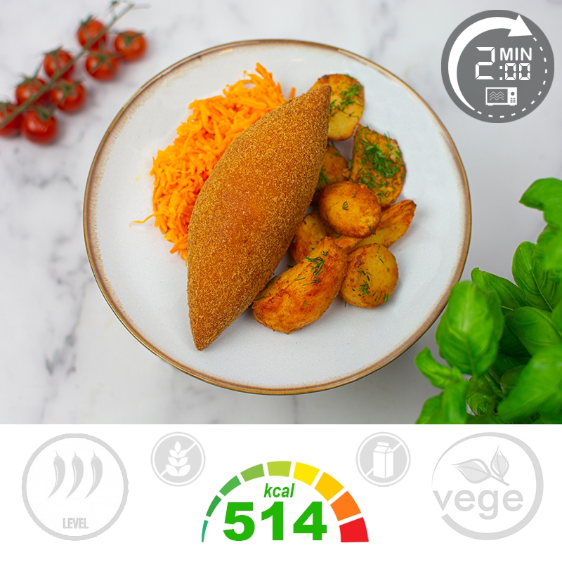 "Składniki: Puree ziemniaczane 37,3% (puree ziemniaczane (ziemniaki (95%), olej rzepakowy, tłuszcz roślinny, sól, biały pieprz) 100%), Kotlet de volaille 37,3% (kotlet de volaille (filet z piersi kurczaka 61,8%, masło /z MLEKA/, JAJA, bułka tarta /GLUTEN/, przyprawy, pieprz czarny, olej rzepakowy, pietruszka nać) 100%), Marchewki glazurowane 25,1% (marchew 87,6%, miód 4,9%, sok pomarańczowy (sok pomarańczowy z soku zagęszczonego, witamina C) 4%, oliwa z oliwek 2,7%, sok z cytryny 0,8%, sól 0%), Natka pietruszki suszona 0,2%